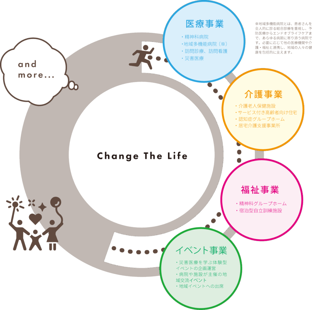 そのためには、医療・介護・福祉ーーーときにはその枠組みにもとらわれずーーー各分野が境目なく連携することが重要です。「世の中の不幸をなくす」という大きな目標を掲げ、グループの総合力で、ひとりひとりと真摯に向き合ってまいります。